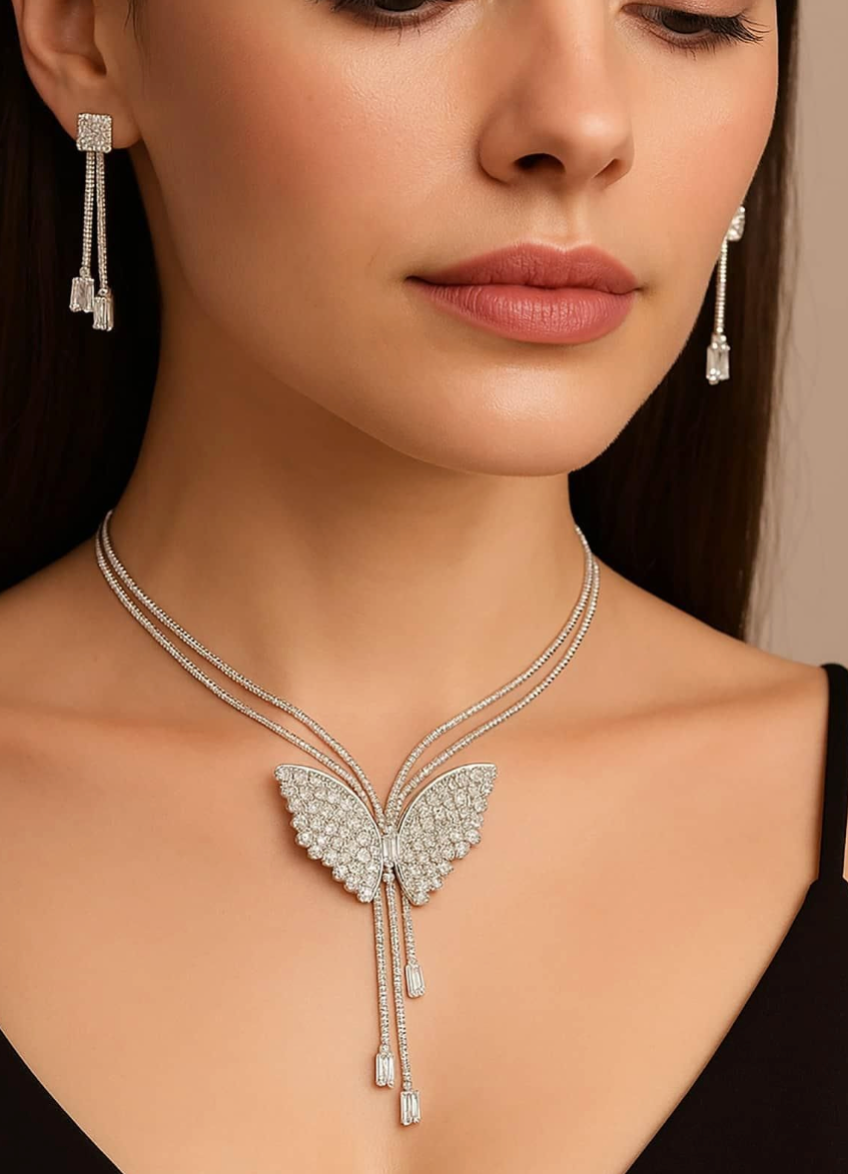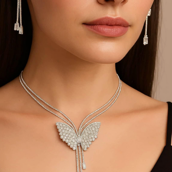 Silver Butterfly Pendant Necklace Set with Crystal-Studded Earrings ? Elegant and Lightweight Party Wear Jewelry